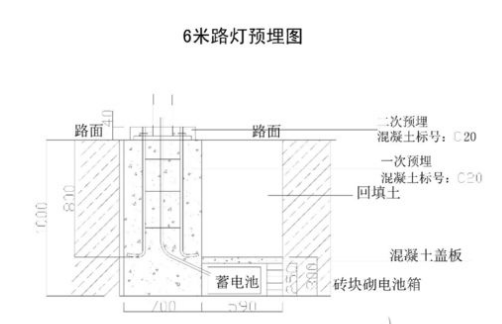 4)、澆筑路燈基礎(chǔ)預(yù)埋件:在開挖的1米深的坑中,把凱創(chuàng)光電預(yù)先焊接的預(yù)埋件放置到坑中,并將鋼絲管放到預(yù)埋件正中間,另放到埋放蓄電池處。并保持預(yù)埋件、地基與地面在同個(gè)水平面上。然后用C20混凝土對(duì)預(yù)埋件進(jìn)行澆筑固定。澆筑過程中不斷攪拌勻稱,以保證整個(gè)預(yù)埋件的密實(shí)性和牢固性。